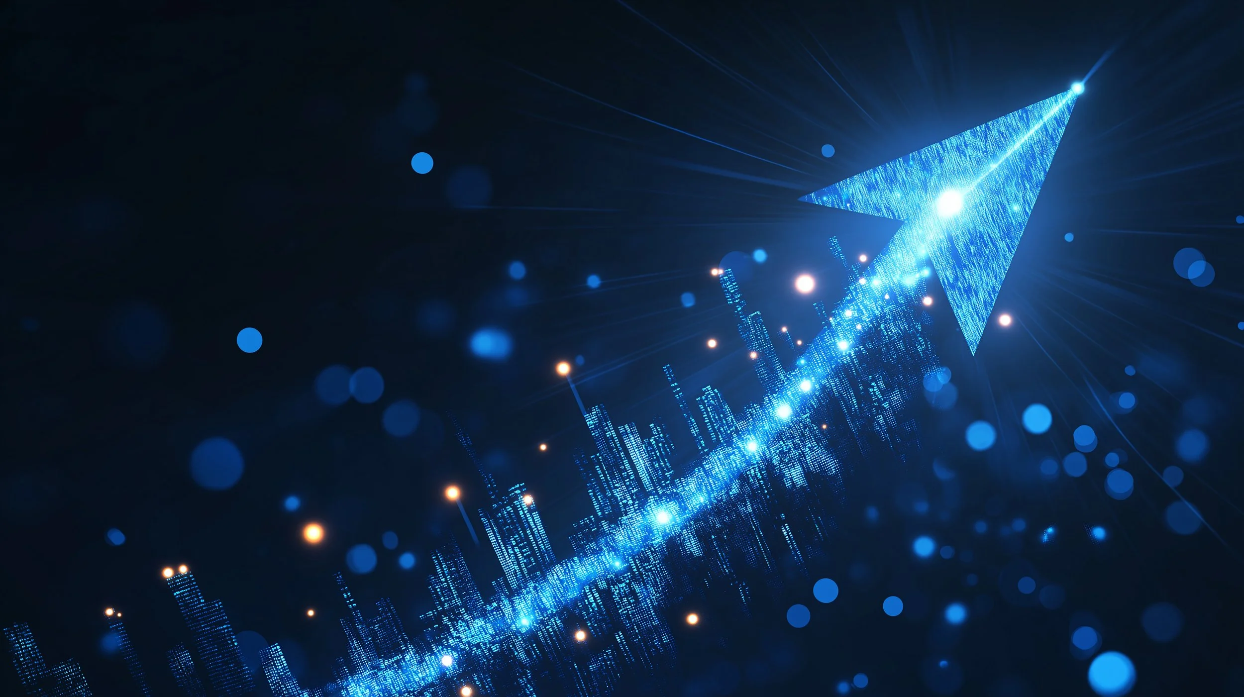 A yellow paper plan flying towards a digital looking city skyline lit up with yellow lights and against a background of connected digital nodes in yellow and orange